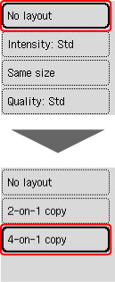Tryck på OK-knappen på skärmen för vänteläge för kopieringen för att visa utskriftsinställningarna. Välj sedan 4-på-1-kopia (4-on-1 copy) en layout från Övriga (Others).