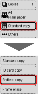Tryck på OK-knappen på skärmen för vänteläge för kopiering för att visa utskriftsinställningarna. Välj sedan Kop. utan ram (Brdless copy).