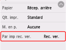 Sélectionnez Paramètres dans l'écran d'attente de copie pour afficher l'écran des paramètres d'impression, sélectionnez Rec. ver. pour Par imp rec. ver., puis OK.