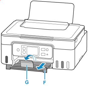 Trek de papieruitvoerlade (F) uit en open het verlengstuk van de uitvoerlade (G).