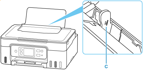 Glisaţi ghidajul pentru hârtie (B) din dreapta pentru a deschide ambele ghidaje pentru hârtie.