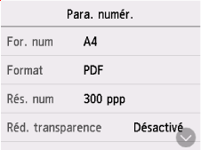 Lorsque l'écran d'attente de numérisation s'affiche, sélectionnez Paramètres pour sélectionner le paramètre. Faites défiler pour afficher les paramètres de configuration et sélectionnez le paramètre pour afficher ses options. Sélectionnez pour spécifier le paramètre.