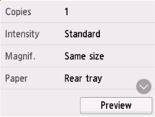 Het scherm met afdrukinstellingen wordt weergegeven wanneer u Instellingen (Settings) selecteert in het stand-byscherm voor kopiëren.