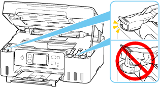 Asiguraţi-vă că sunt închise bine capacele rezervoarelor de la rezervoarele de cerneală. În cazul în care capacele rezervoarelor sunt deschise, închideţi capacele rezervoarelor în mod corespunzător.