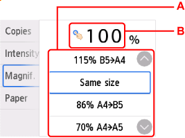 Ecranul de mai jos se afişează când selectaţi opţiunea Setări (Settings) din ecranul de standby pentru copiere şi selectaţi Măr/micş (Magnif.) pentru a selecta metoda de micşorare/mărire. Specificaţi gradul de mărire/micşorare şi selectaţi OK.