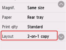 Selectaţi Setări (Settings) pe ecranul de standby pentru copiere pentru a afişa ecranul cu setările de imprimare. Selectaţi Copie 2-pe-1 (2-on-1 copy) la Aspect (Layout), apoi selectaţi OK.