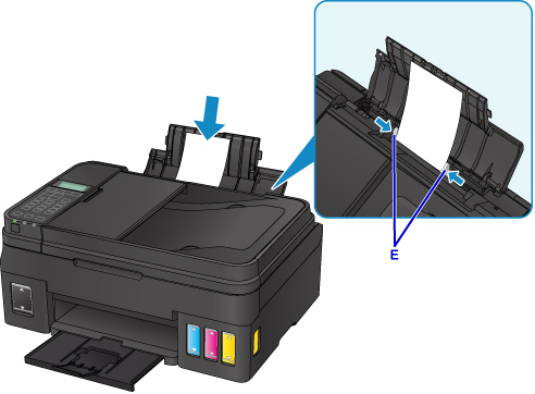قم بإزاحة موجهي الورق (E) لفتحهما، ثم قم بتحميل الأظرف في منتصف الدرج الخلفي مع توجيه وجه العنوان لأعلى.