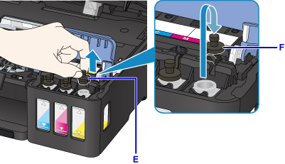 Chytněte a sejměte krytku nádržky (E) z nádržky s inkoustem, kterou se chystáte doplnit.