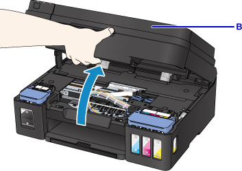 Para rellenar el depósito de tinta negra, abra la cubierta del depósito de tinta que se encuentra a la izquierda (C).