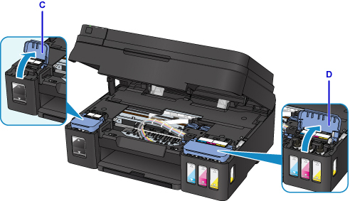 Om du ska fylla på färgbläckbehållare öppnar du det högra bläckbehållarlocket (D).