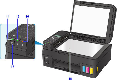 Turns the power on or off. Before turning on the power, make sure that the document cover is closed.