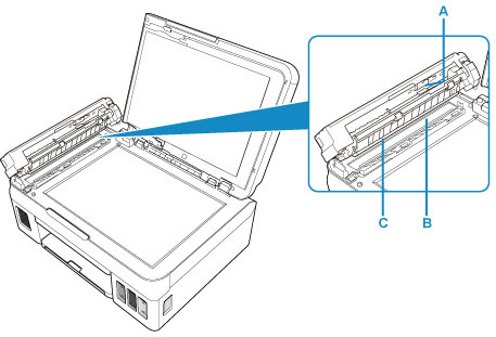 Σκουπίστε απαλά το τζάμι του ADF (B) και την εσωτερική πλευρά του καλύμματος τροφοδότη εγγράφων (λευκή επιφάνεια) (C).