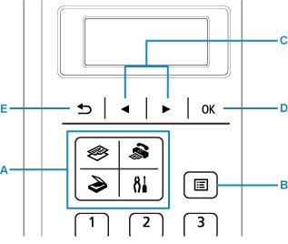 使用操作面板上的模式按鈕(A)可以在影印模式、掃描模式、傳真模式和設定功能表螢幕之間切換。