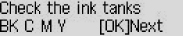 Nếu bật chức năng thông báo lượng mực còn lại, thông báo Kiểm tra bình mực(Check the ink tanks) và chỉ thị màu (BK/C/M/Y) của mực sắp hết sẽ xuất hiện trên màn hình LCD khi gần hết mực. Chức năng này được bật theo mặc định.