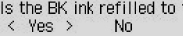 6. Nếu bạn đặt lại mức lượng mực còn lại của mực BK, nạp lại đầy bình mực BK đến đường giới hạn trên, sử dụng nút TRÁIPHẢI để chọn Có(Yes) và nhấn nút OK.