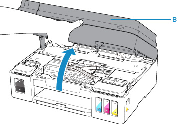 Để nạp lại đầy bình mực đen, mở nắp khay bình mực trái (C).