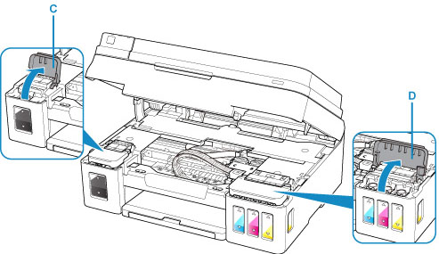 Để nạp lại đầy bình mực màu, mở nắp khay bình mực phải (D).