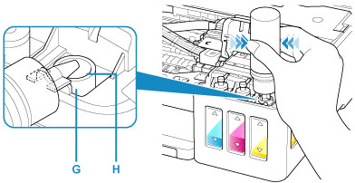 Căn vòi phun của lọ nạp mực với miếng đỡ lọ nạp (G) trên máy in, lồng vòi phun vào đầu nạp mực (H).