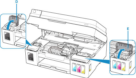Būtinai atidarykite rašalo talpyklos dangtelius (D) (E).