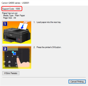 Ja rodas kļūda, datora ekrānā vai LCD ekrānā tiek parādīts ziņojums. Atkarībā no kļūdas datora ekrānā vai LCD ekrānā tiek parādīts atbalsta kods (kļūdas numurs).