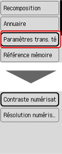 La résolution de l'image numérisée et le contraste de numérisation pendant la transmission de fax peuvent être définis lorsque vous sélectionnez Paramètres trans. télécopie dans le Menu d'un écran d'attente de télécopie.