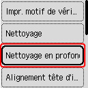 Si le nettoyage standard de la tête d'impression ne permet pas d'améliorer la qualité d'impression, procédez à un nettoyage en profondeur de la tête d'impression. Le nettoyage en profondeur de la tête d'impression requiert une plus grande quantité d'encre qu'un nettoyage normal de la tête d'impression : vous ne devez donc nettoyer la tête d'impression qu'en cas d'absolue nécessité.