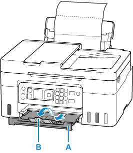 Estrarre il vassoio di uscita della carta (A) e aprire l'estensione del vassoio di uscita (B).