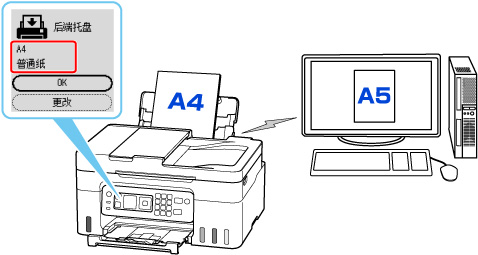 例如,如果用于打印/复印的纸张设置为A5,而打印机上注册的纸张信息为A4,则打印机将在后端托盘中装入的纸张上开始打印/复印,而不更改用于打印/复印的纸张尺寸设置。