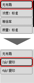 在复印待机屏幕上按OK按钮以显示打印设置屏幕,然后从布局的其他中选择2合1复印。