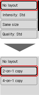 Yazdırma ayarı ekranını görüntülemek için Kopyalama bekletme ekranında OK düğmesine basın ve Diğerleri (Others) bölümündeki bir düzenden 2'li kopya (2-on-1 copy)'yı seçin.