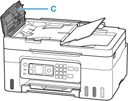 3. Dùng miếng vải đã chuẩn bị để lau sạch tất cả bụi giấy từ bên trong nắp bộ nạp tài liệu (C).