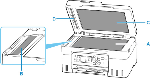 Лепило, мастило, коректор или други субстанции по стъклената повърхност (B) може да доведат до черни ивици в сканираните изображения. Внимателно избършете всички тези вещества от стъклото.
