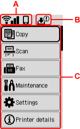 Valitse kukin kohde, kun haluat käyttää tulostimen perustoimintoja, huoltaa tulostimen tai muuttaa kutakin asetusta.