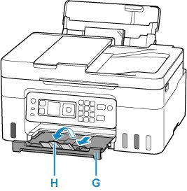 7. Húzza ki a papírgyűjtő tálcát (G), és nyissa ki a papírgyűjtő tálca hosszabbítóját (H).