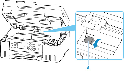 3. Samtidigt som du roterar pappersmatningshjulet (A) som finns i det bakre facket fler än två full varv, torkar du av dem med en trasa som kramats ur hårt efter att den fuktats.