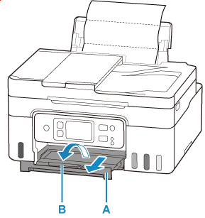 Pull out the paper output tray (A) and open the output tray extension (B).