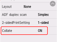 Pilih Setelan(Settings) pada layar siaga penyalinan untuk menampilkan layar setelan cetak. Pilih Kolasi(Collate) dan pilih NYALA(ON).
