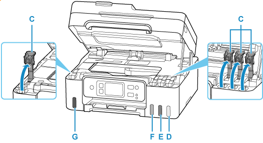 Abra la tapa del depósito (C) del depósito de tinta que desea rellenar.
