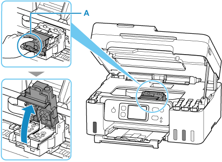 Ouvrez le couvercle de verrouillage de tête d'impression en saisissant la molette (A) et sélectionnez Suivant.