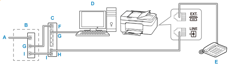 分线器未内置于xDSL调制解调器中时,请勿分接分线器(墙面)之前的电话线。 也请勿并行连接分线器。 打印机可能无法正常工作。