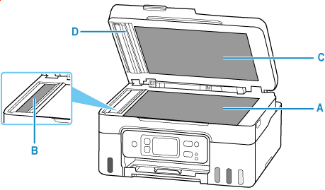 擦拭稿台玻璃的玻璃表面(A和B)以及与这些表面接触的部分(C和D)以清除所有污迹或灰尘。