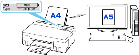 على سبيل المثال، عندما يكون إعداد الورق للطباعة هو A5، وتكون معلومات الورق المسجلة في الطابعة هي A4، تبدأ الطابعة في الطباعة على الورق الذي تم تحميله في الدرج الخلفي بدون تغيير إعداد حجم الورق للطباعة.