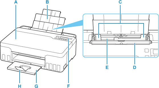 - G: Bac de sortie papier