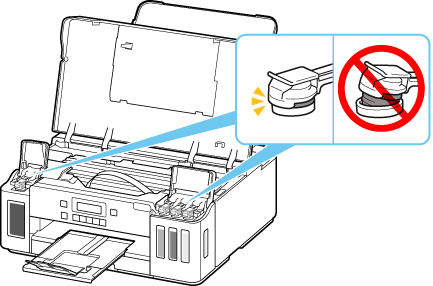 • Varmista, että mustesäiliöiden säiliön korkit on suljettu kunnolla. Jos mustesäiliön kansi on auki, sulje säiliön korkit oikein.