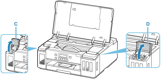 Za nadopunjavanje spremnika tinte u boji otvorite desni poklopac spremnika tinte (D).