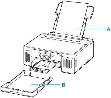 Pencetak memiliki dua sumber kertas untuk menyalurkan kertas, tatakan belakang (A) dan kotak kertas (B).