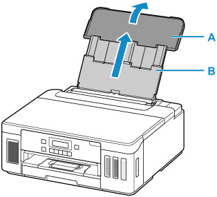 Відкрийте кришку заднього лотка (A). Витягніть прямо вгору та зігніть назад підпору для паперу (B).