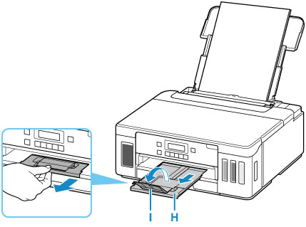 Trek de papieruitvoerlade (H) uit en open het verlengstuk van de uitvoerlade (I).
