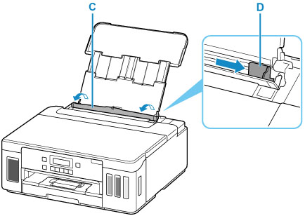 4. Glisaţi ghidajul pentru hârtie (D) din dreapta pentru a deschide ambele ghidaje pentru hârtie.