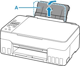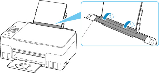 Ilæg langt papir uden at åbne papirstøtten. Afhængig af papirets vægt kan den forreste kant blive hævet, og udskrivningen kan blive forrykket. Sørg for, at den forreste kant af papiret ikke hæves, f. eks. ved at holde den del, der rager op fra den bagerste bakke.